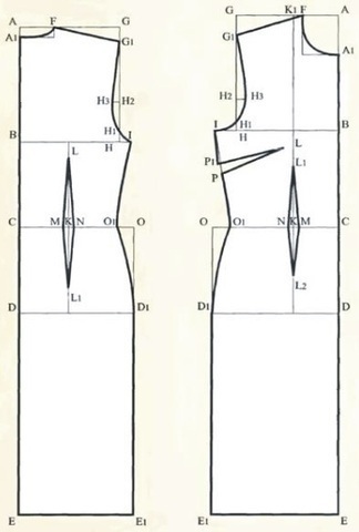 АЕ = длина платья (Ди ) = АЕ (с чертежа спинки) + (длина переда до талии (Дпт ) - длина спины до талии (Дпс )).
